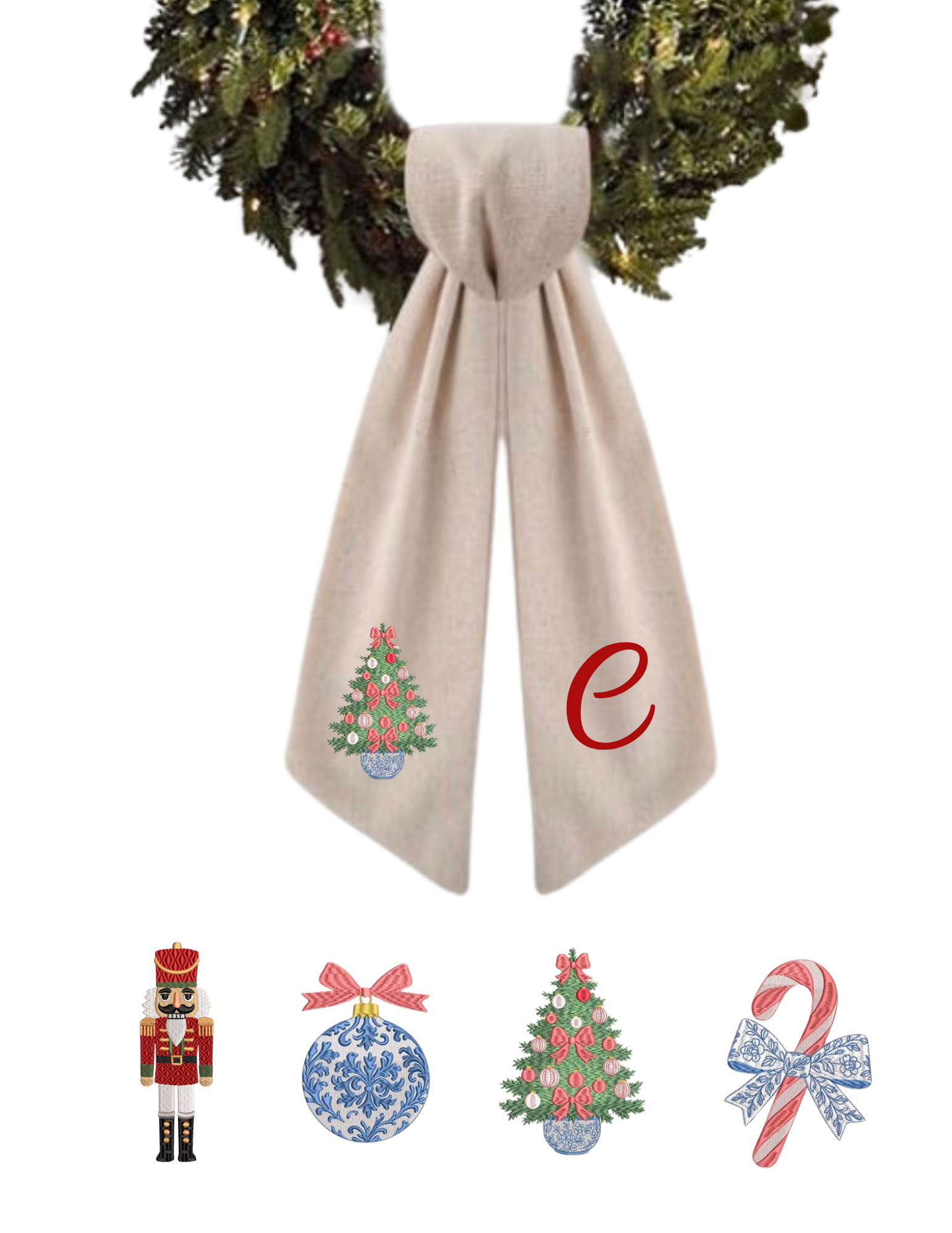 Transform your holiday décor with this stunning wreath sash that brings festive flair to any entrance. Choose from four distinctive designs, each personalized with a single initial of your choice. Watch as the elegant details catch the light, creating a warm, welcoming glow that makes your front door the neighborhood's standout display. Perfect for adding that special custom touch to your seasonal decorations.